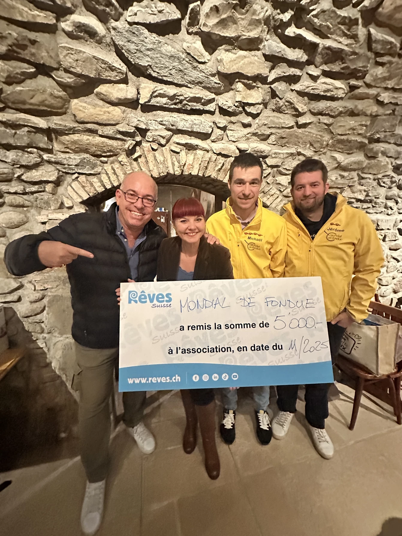 Depuis 10 ans, les organisateurs du Mondial de Fondue soutiennent notre association avec une fidélité et une belle générosité. Lors de la dernière édition, ils ont renouvelé leur engagement en offrant un chèque de CHF 5’000.-, un geste qui nous touche profondément et renforce encore les liens qui nous unissent.