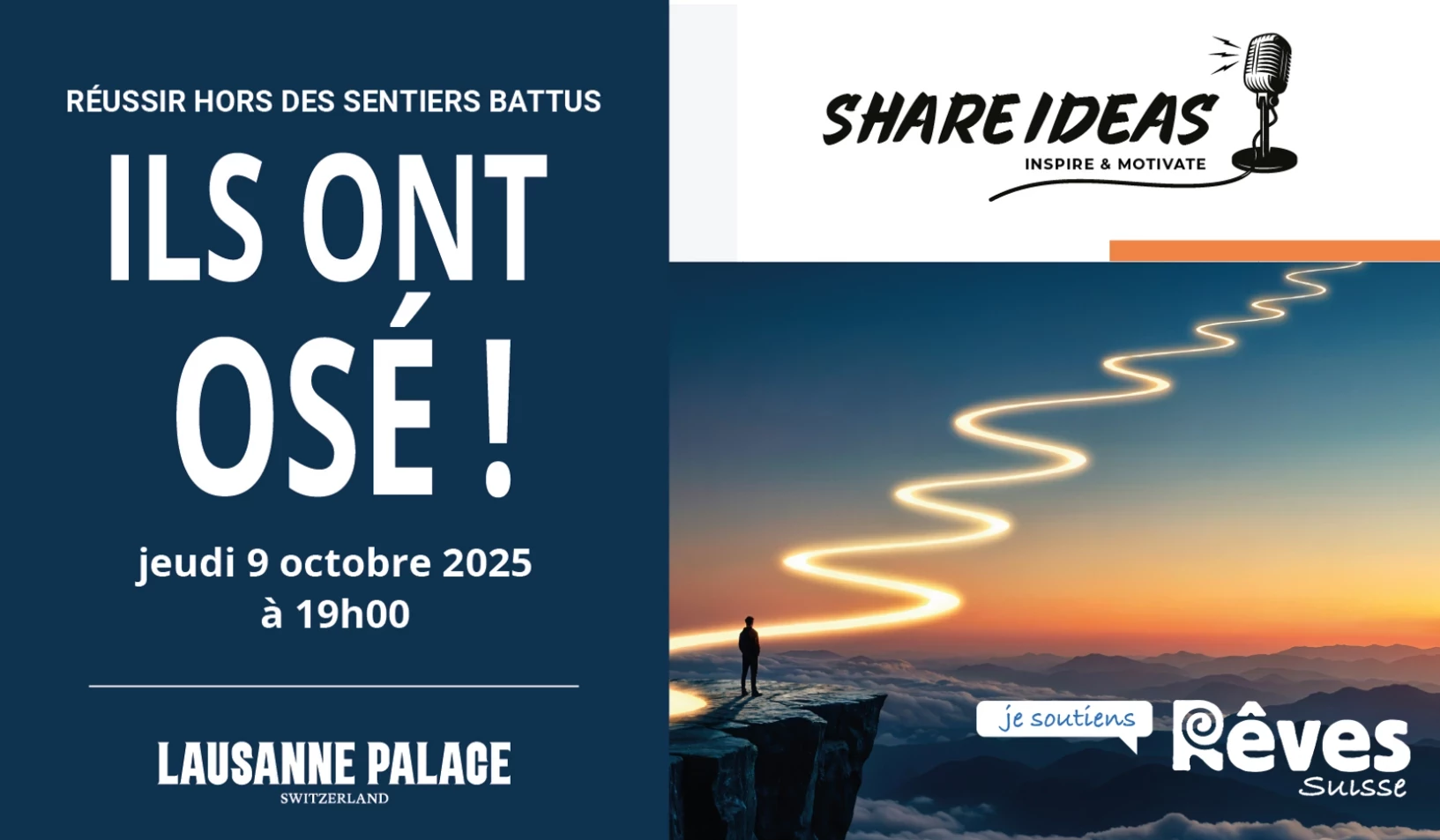 Lors de chaque conférence organisée par Share Ideas, CHF 1.- par entrée et CHF 2.- par entrée VIP seront reversés à Rêves Suisse, l’association qui depuis bientôt 20 ans réalise les rêves des enfants atteints de maladie, en situation de handicap ou traversant de grandes souffrances émotionnelles.